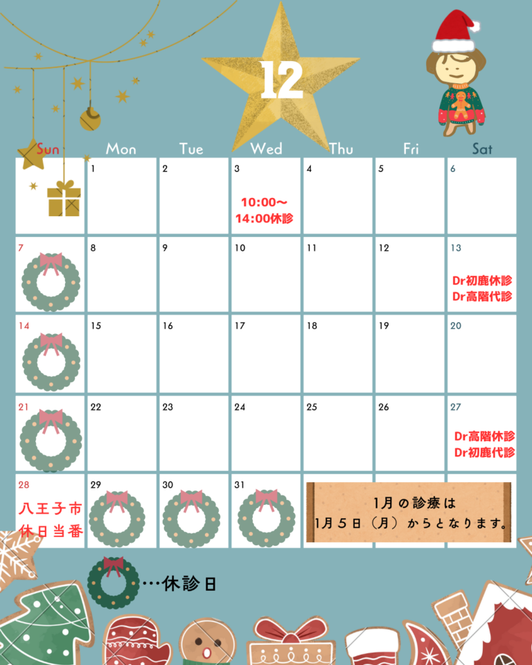 休診期間: 2023年12月29日(金)~ 2023年1月3日(水)