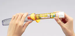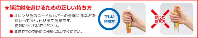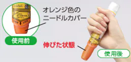 - オレンジ色のニードルカバーが伸びていない場合は、注射は完了していませんので、再度、ステップ1〜3を繰り返して注射してください。