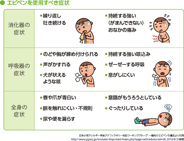 エピペンが処方されている場合、もしアナフィラキシーショックが起きているかもしれないと思ったら、以下の症状のうち、たとえ1つだけでも見られた場合、すぐにエピペンを使用し、その後速やかに救急車を呼ぶようにしてください。