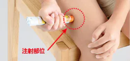 エピペンを太ももの前外側に垂直になるようにし、オレンジ色のニードルカバーの先端を「カチッ」と音がするまで強く押し続けます。太ももに押し付けたまま数秒間待ちます。エピペンを太ももから抜き取ります。